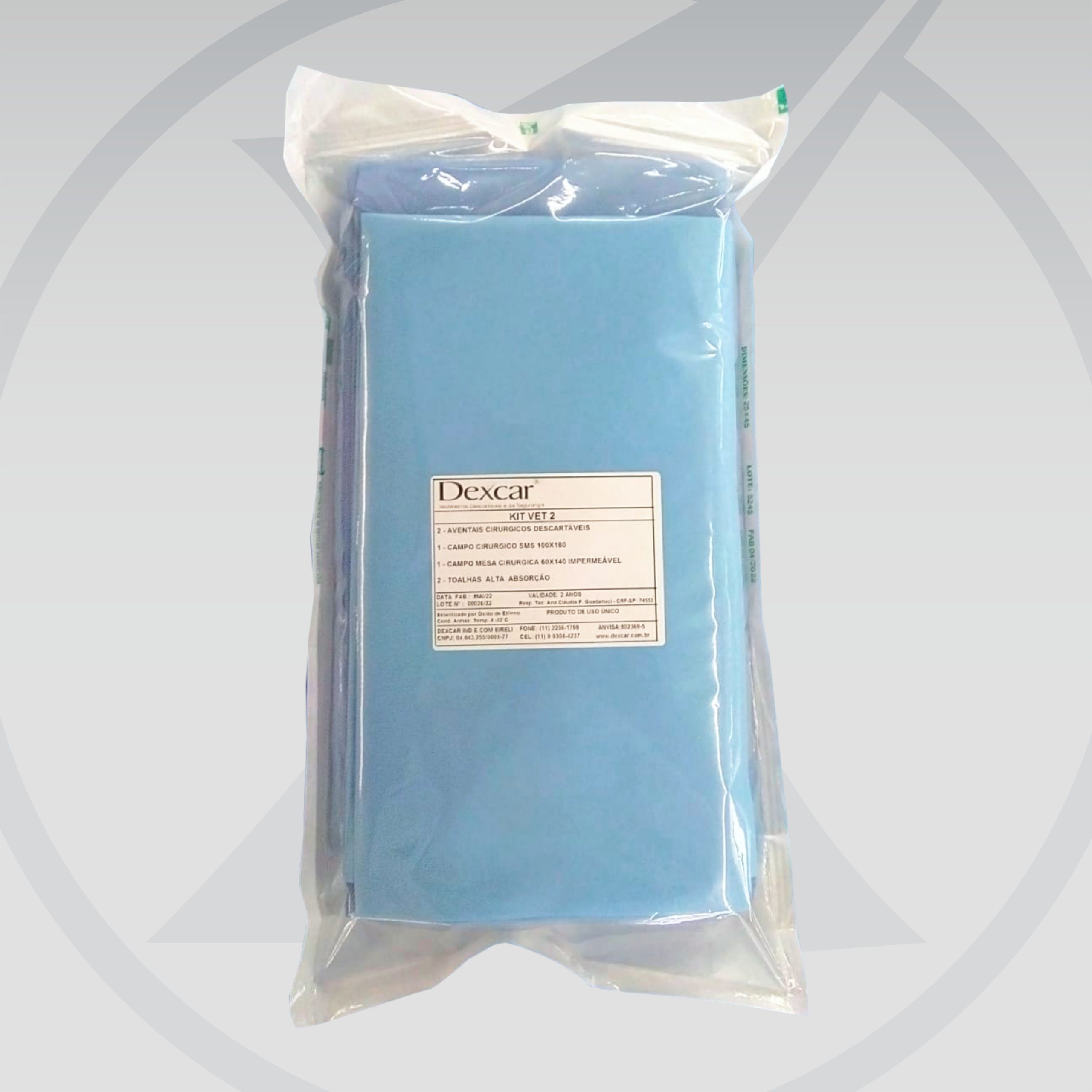 Kit completo composto por Aventais Cirúrgicos em SMS, Campos Impermeáveis de Mesa em SMS, Campos Cirúrgicos em SMS, Toalhas Absorventes. Embalado em envelope grau cirúrgico unitariamente (cada kit) e esterilizado por Óxido de Etileno.